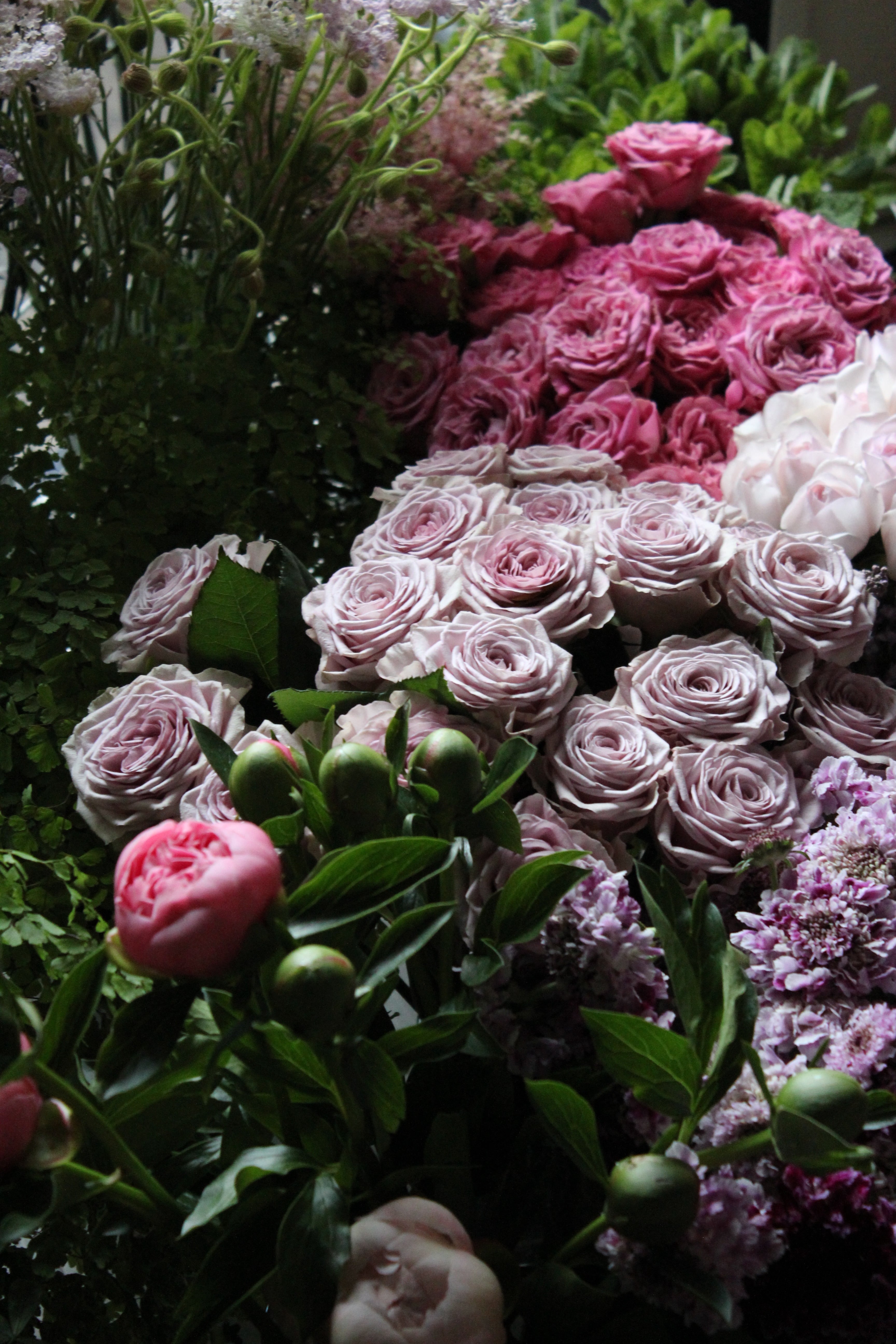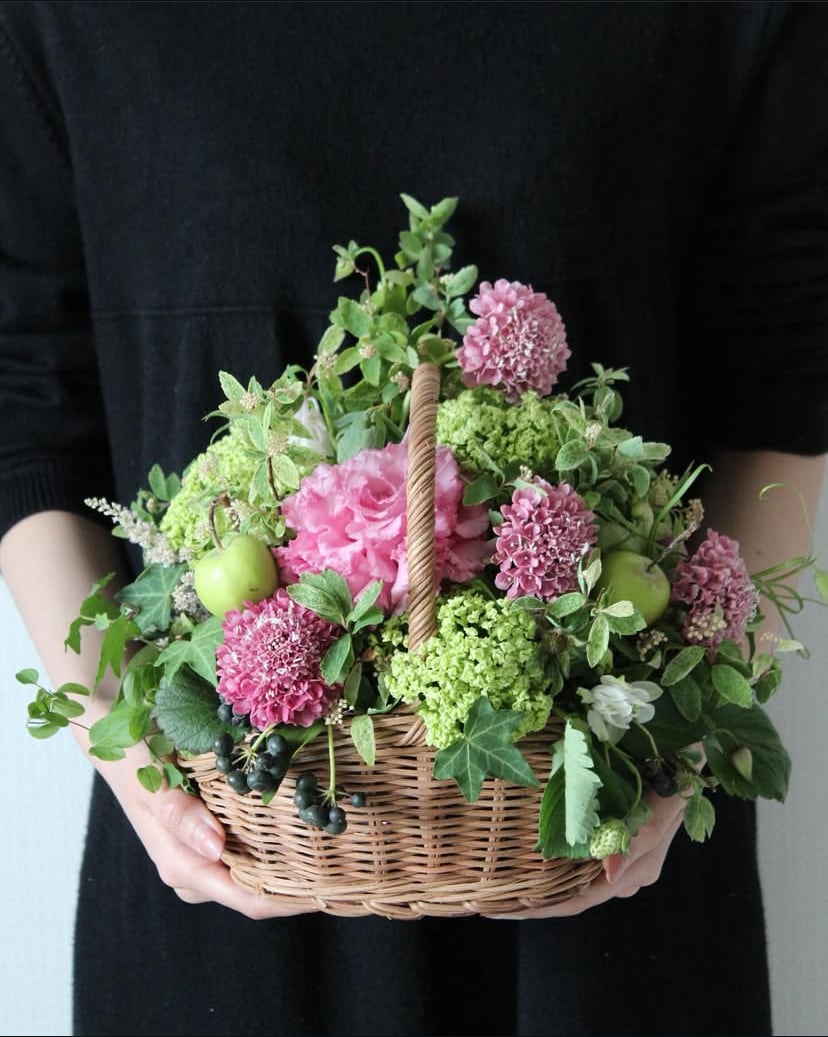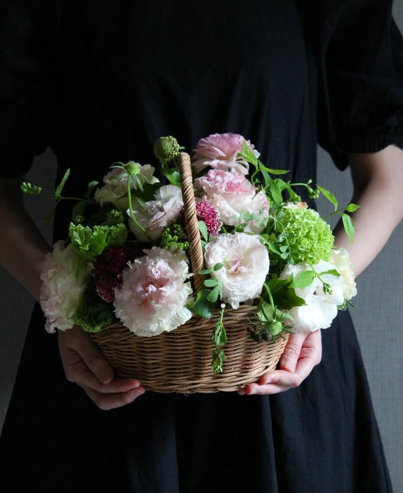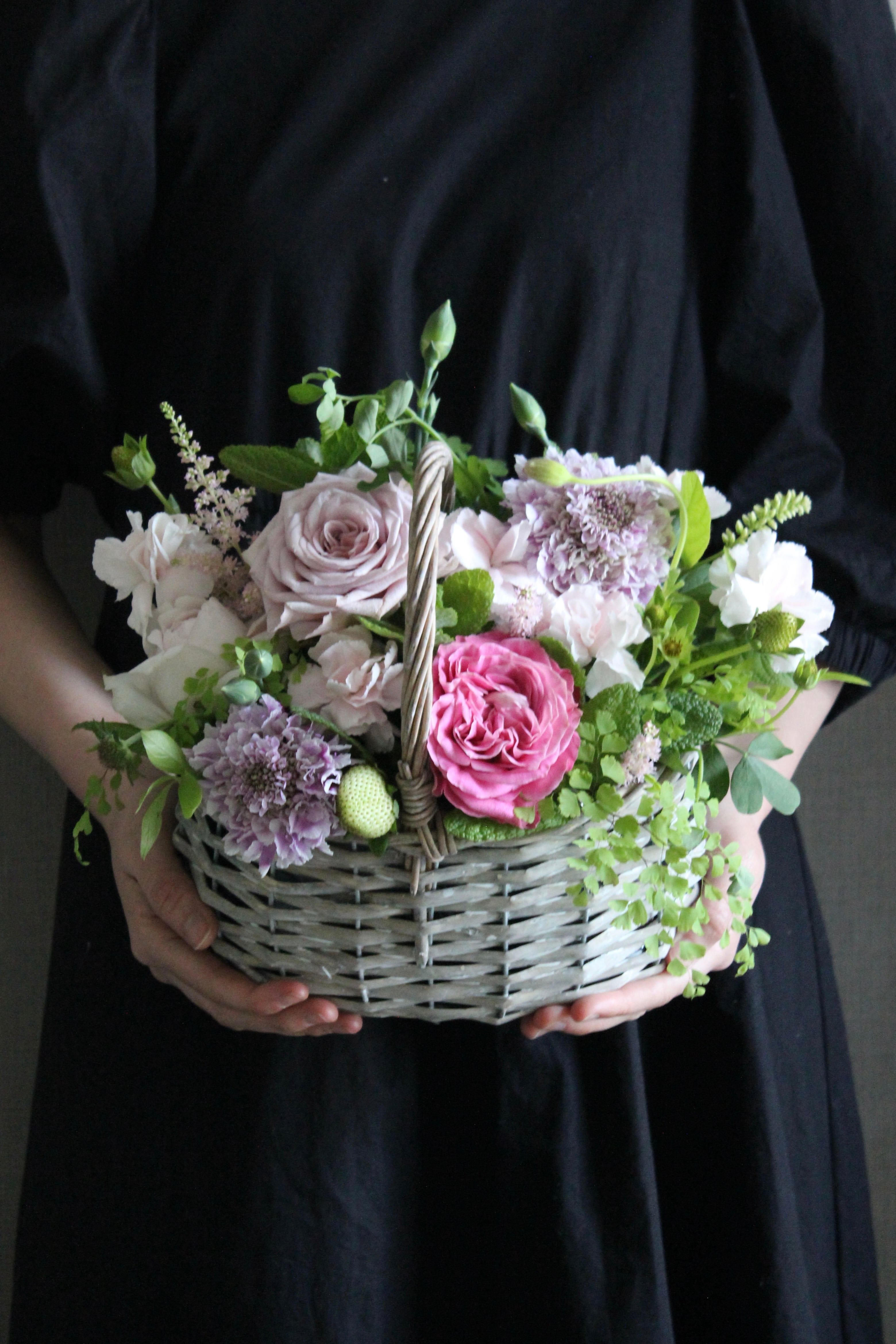 フレッシュグリーンに母の日をイメージしたピンクを始めとする季節の花々を使用してお作りさせていただきます。