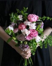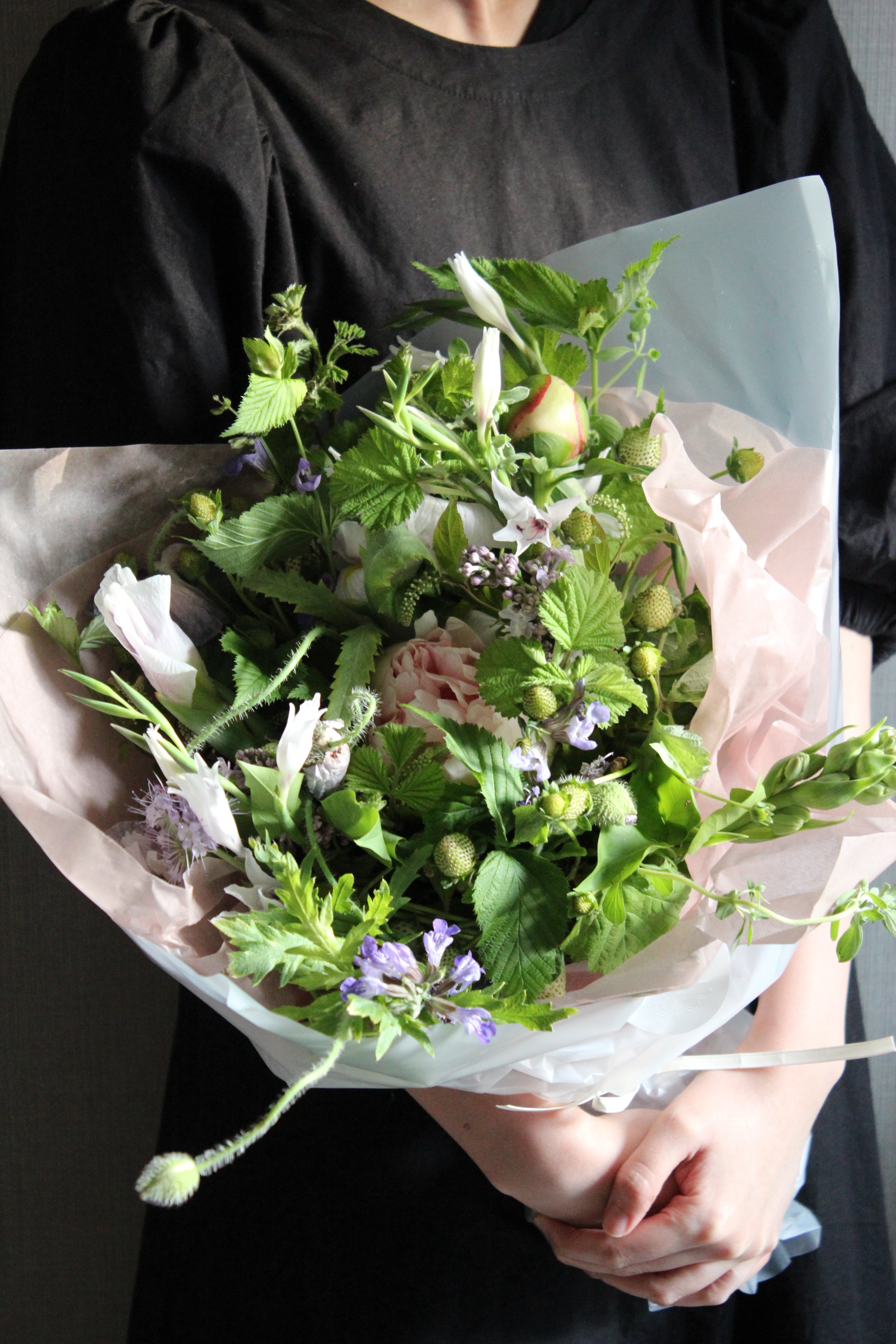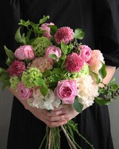 フレッシュグリーンに母の日をイメージした色合いの花々を使用してお作りさせていただきます。