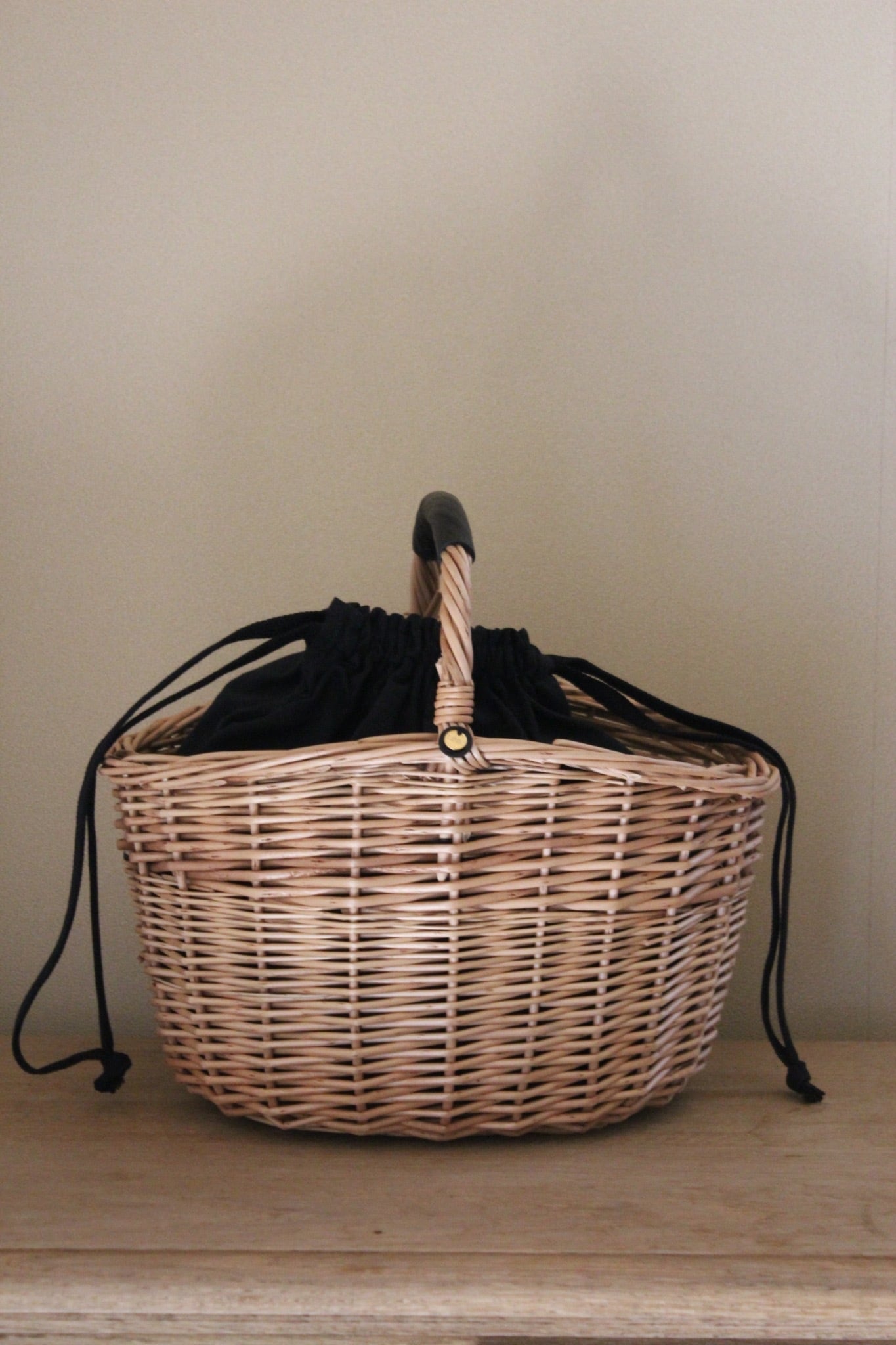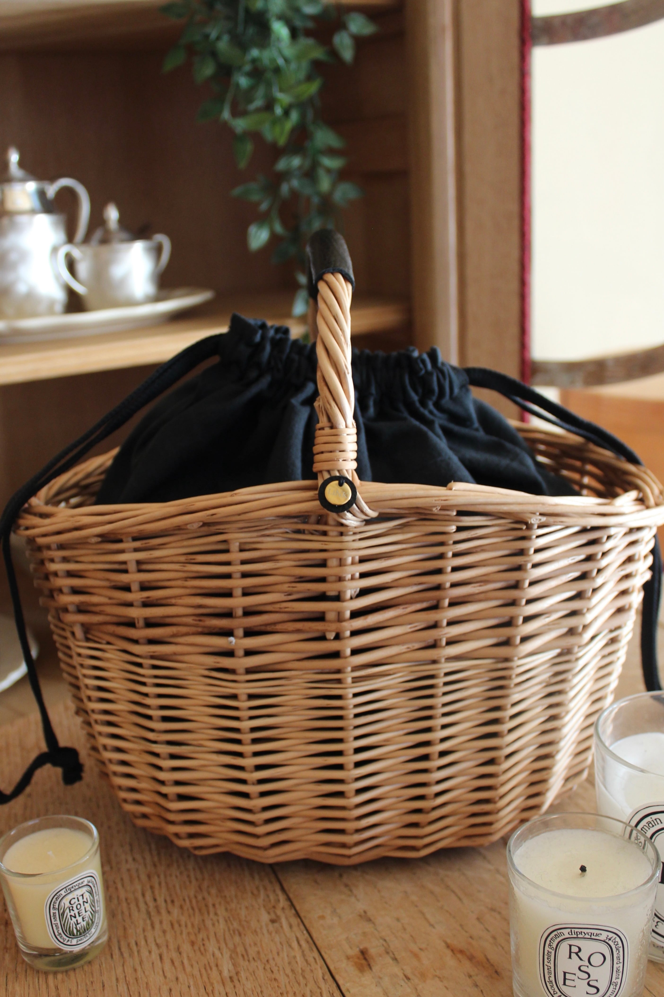 縁の緩やかなカーブが特徴的なバスケットに、レザーハンドルの持ち手と内布を組み合わせたワンハンドルの籠バッグになります。