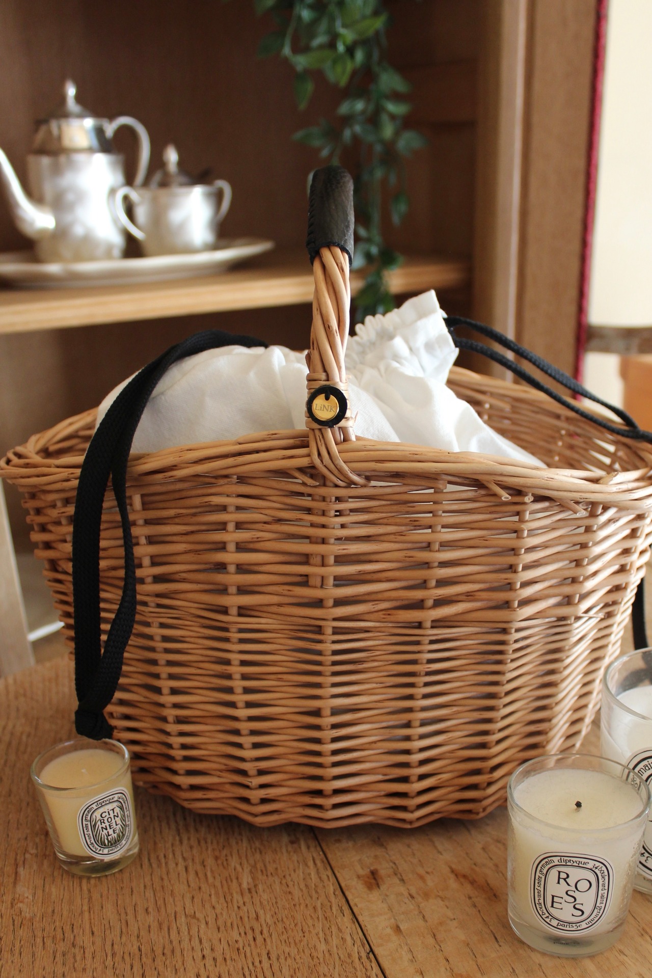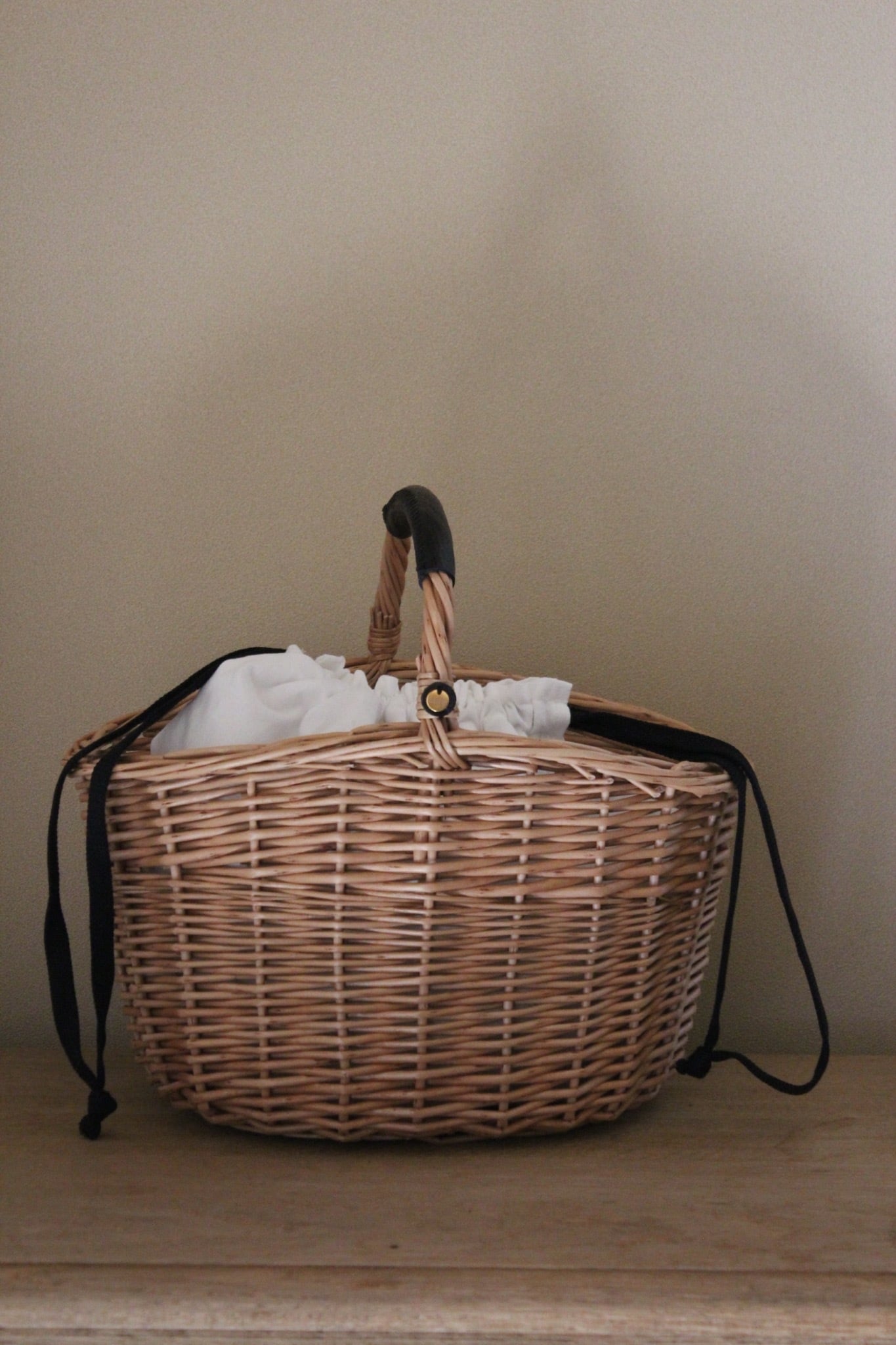縁の緩やかなカーブが特徴的なバスケットに、レザーハンドルの持ち手と内布を組み合わせたワンハンドルの籠バッグになります。