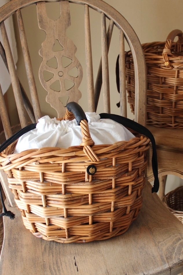 コロンとしたフォルムが特徴的なバスケットに、レザーハンドルの持ち手と内布を組み合わせたワンハンドルの籠バッグになります。