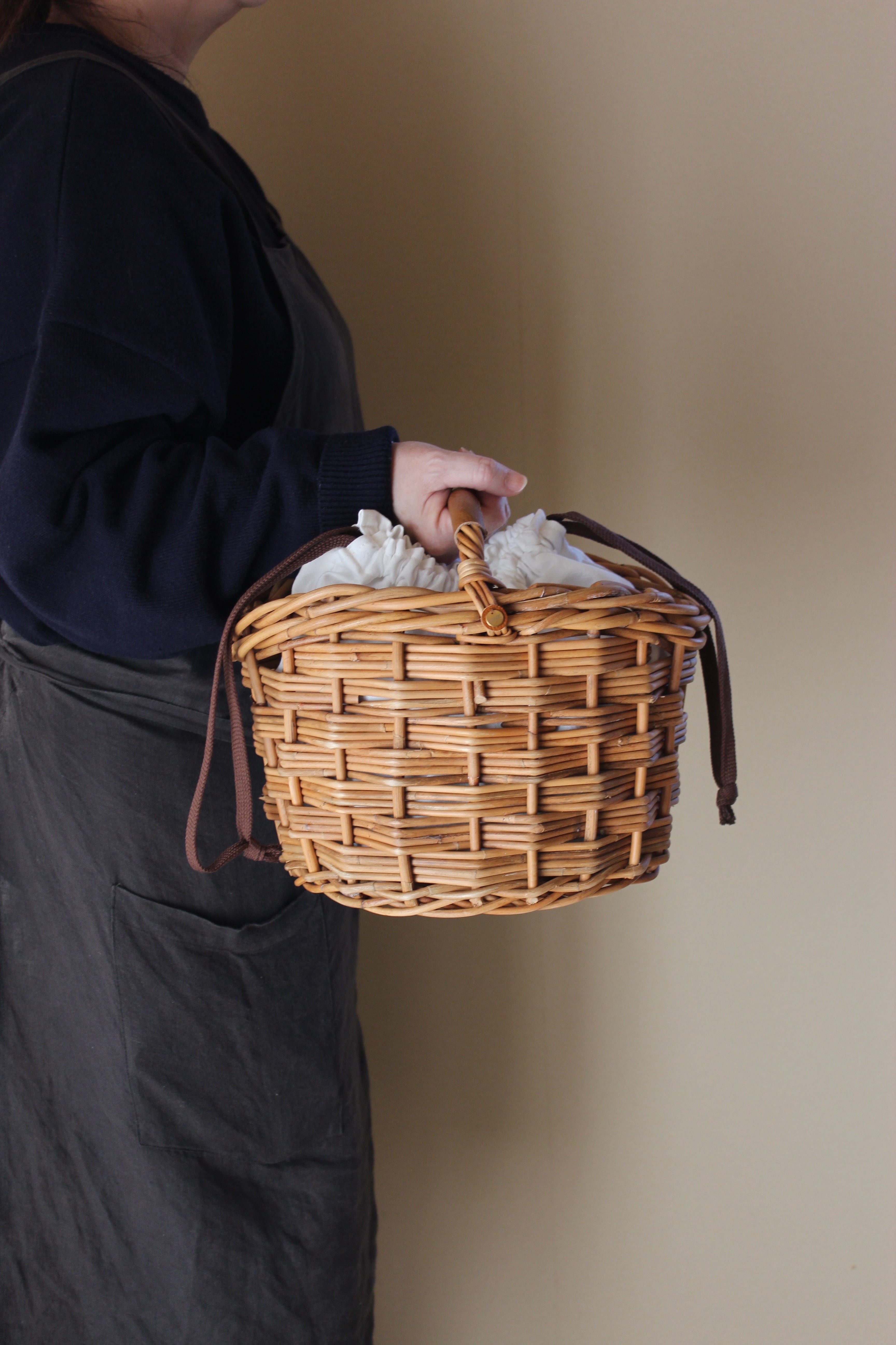 コロンとしたフォルムが特徴的なバスケットに、レザーハンドルの持ち手と内布を組み合わせたワンハンドルの籠バッグになります。